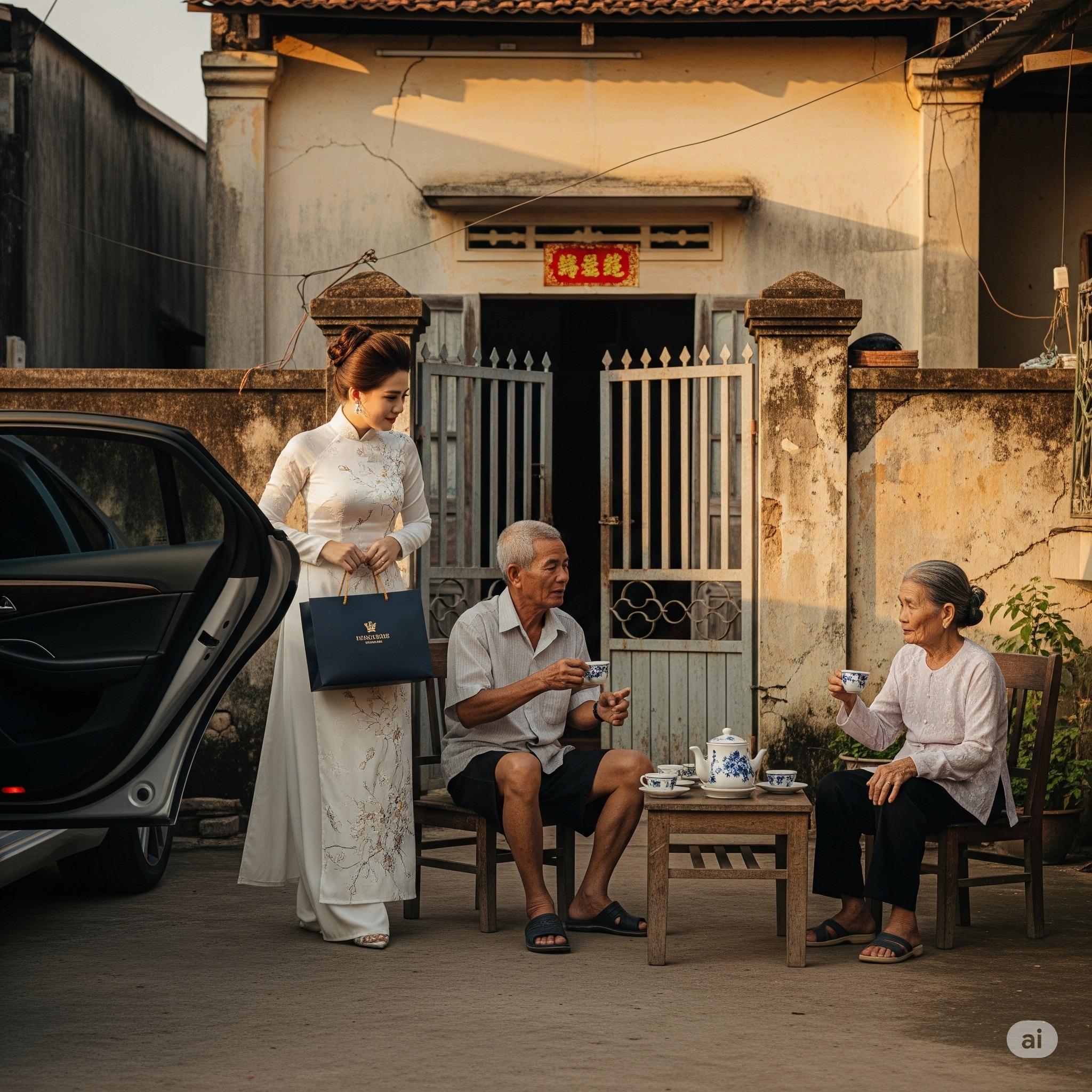 Vừa bước tới cổng, tôi đã thấy sân trước bày mâm cỗ lớn, rực rỡ đèn đóm. Mùi thơm của nem rán, giò nạc, gà luộc dậy khắp ngõ. Tôi đứng khựng lại, tim đập mạnh. Không lẽ bố mẹ tổ chức tiệc mừng gì mà không báo?