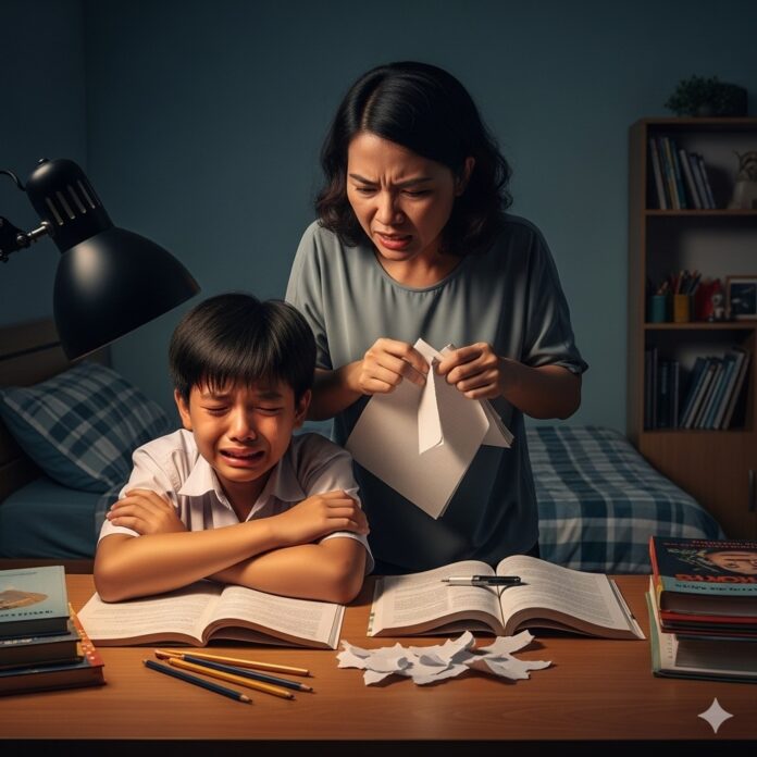 Bố ơi, giúp con với, mẹ kế bắt con nghỉ học, mẹ rút hết lõi các quyển vở của con vứt qua