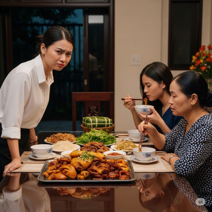Con dâu và con gái cùng ở cữ, tôi phải ăn cơm móng giò cả tháng đến phát ngán để có sữa cho cháu bú, thế mà khi vô tình bước sang phòng em chồng, tôi chết lặng nhìn mâm cơm bốc khói nghi ngút trước mặt cô ấy — đầy đủ gà hầm, cá hồi, hoa quả cắt sẵn, canh tần hầm đủ vị. Tôi quay vào, gọi thẳng mẹ chồng ra giữa sân mà nói đúng một câu. Bà nghe xong chỉ biết há hốc miệng rồi… phải nhộ-t lại ngay câu nói từng hùng hồn tuyên bố trước kia.