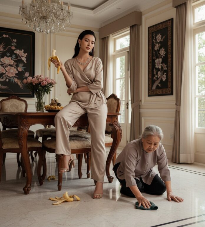 Bà cụ lúng túng làm theo, không may làm rơi mấy quả nho xuống nền gạch. Hà bĩu môi: