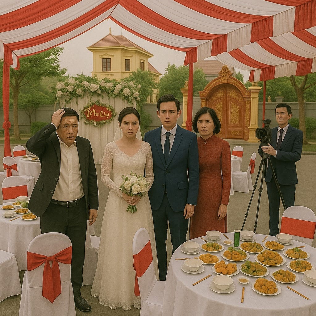 9 giờ sáng, dàn nhạc đã rộn ràng, mâm cỗ nghi ngút khói, nhưng cả khu rạp cưới chỉ lác đác vài người giúp việc và thợ quay phim. Không có khách. Không một hàng xóm. Không ai trong làng đến dự.