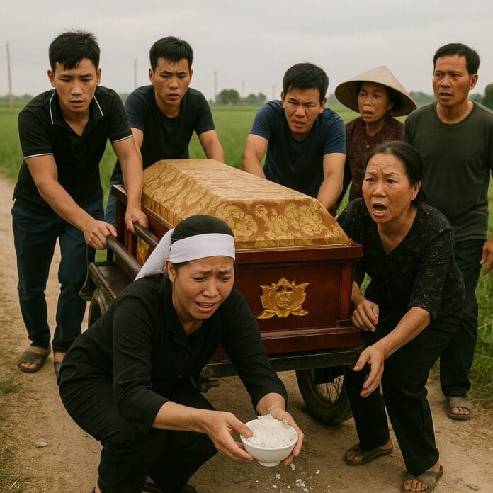 Nhưng… vừa đi tới lối rẽ vào đồng, gió không rõ từ đâu nổi lênbát cơm trên quan tài rơi thẳng xuống đất vỡ tan tành.