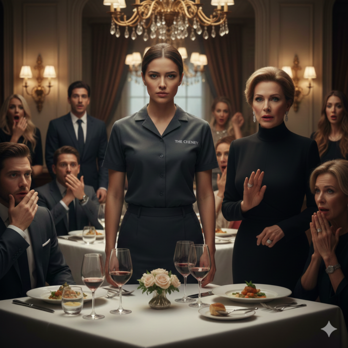 But she wasn’t finished. She stood, knocking over her wine glass deliberately so it splashed across my apron. Then, with a sneer that twisted her carefully contoured face, she reached out and grabbed the collar of my uniform shirt.